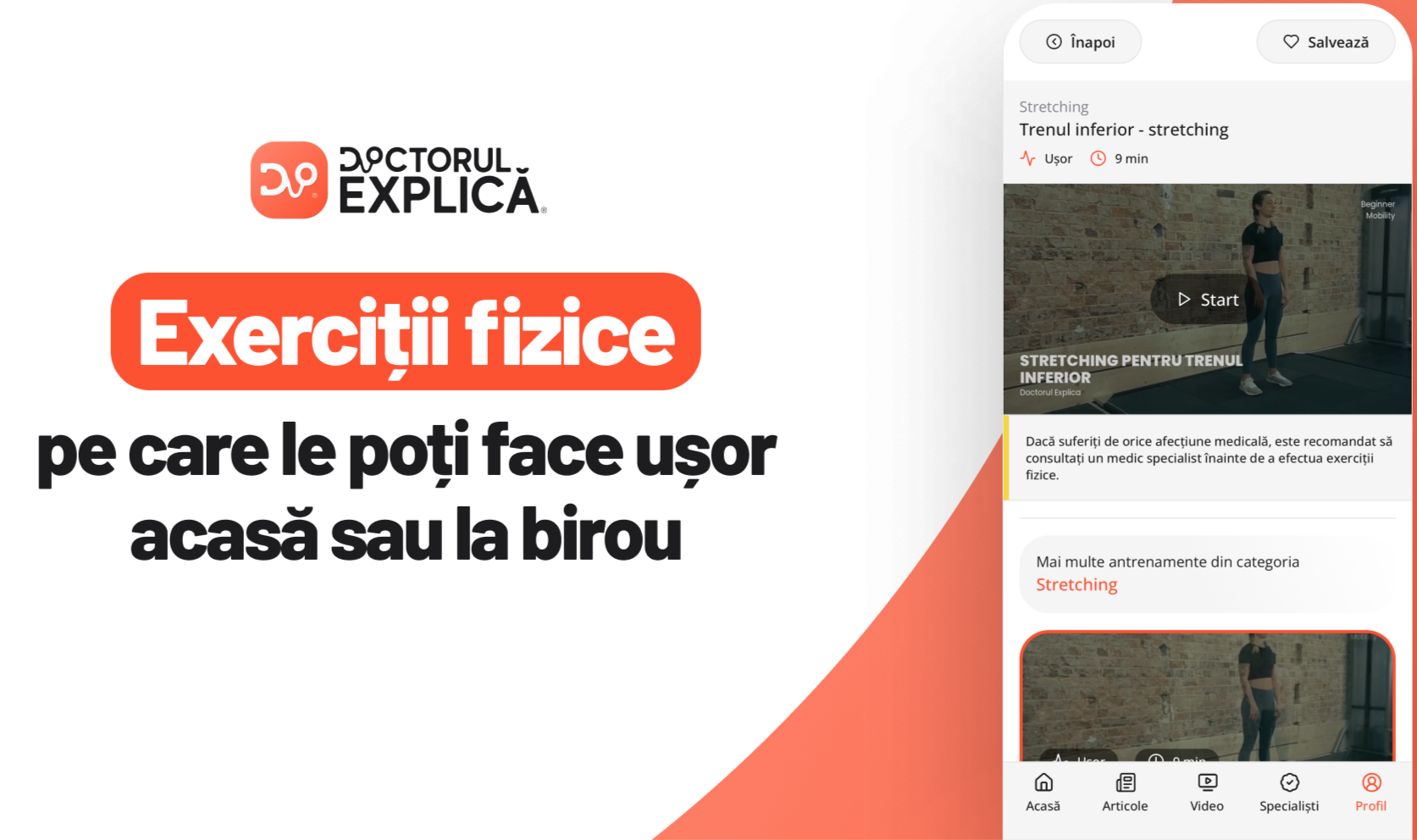 Mișcarea este una dintre cele mai eficiente forme de terapie. Dar nu trebuie să însemne ore întregi la sală. În aplicația Dr. Explică vei găsi antrenament scurte, eficiente, care îți redau energia. Fie că vrei să îți îmbunătățești postura, să elimini durerile de spate sau să-ți menții tonusul, exercițiile sunt adaptate nivelului tău și te ghidează pas cu pas.